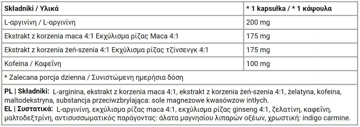 | Συστατικά | L-αργινίνη, εκχύλισμα ρίζας maca 4:1, εκχύλισμα ρίζας ginseng 4:1, ζελατίνη, καφεΐνη, μαλτοδεξτρίνη, αντισυσσωματικός παράγοντας: άλατα μαγνησίου λιπαρών οξέων, χρωστική: indigo carmine. |