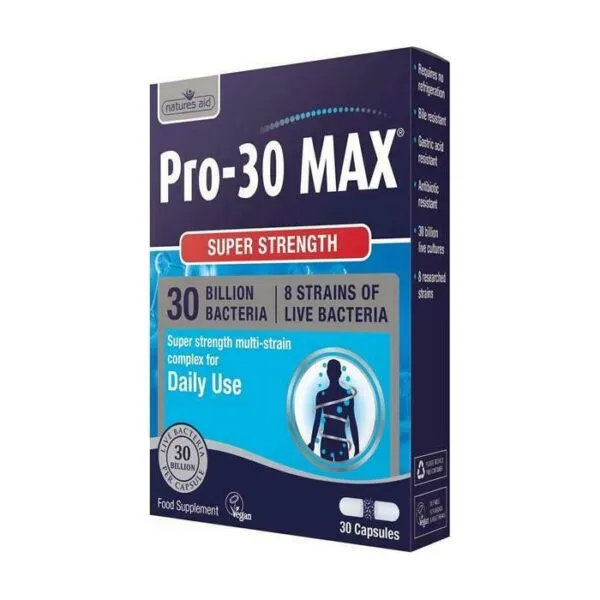 Το Natures Aid Pro-30 MAX 8 Strain Complex προσφέρει 30 δισ. προβιοτικά για υγιές έντερο, καλύτερη πέψη και καθημερινή εντερική υποστήριξη.